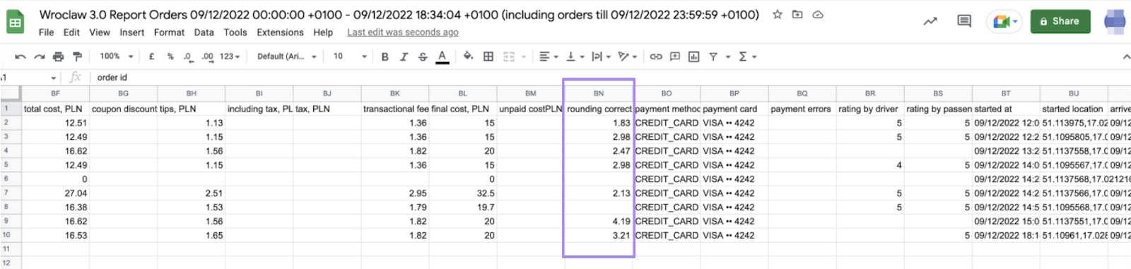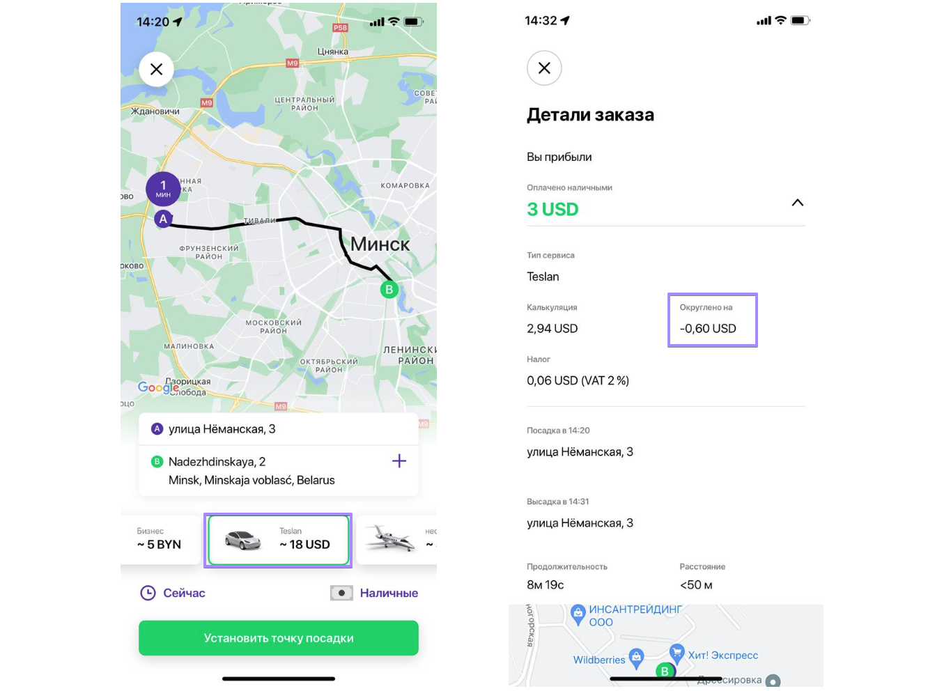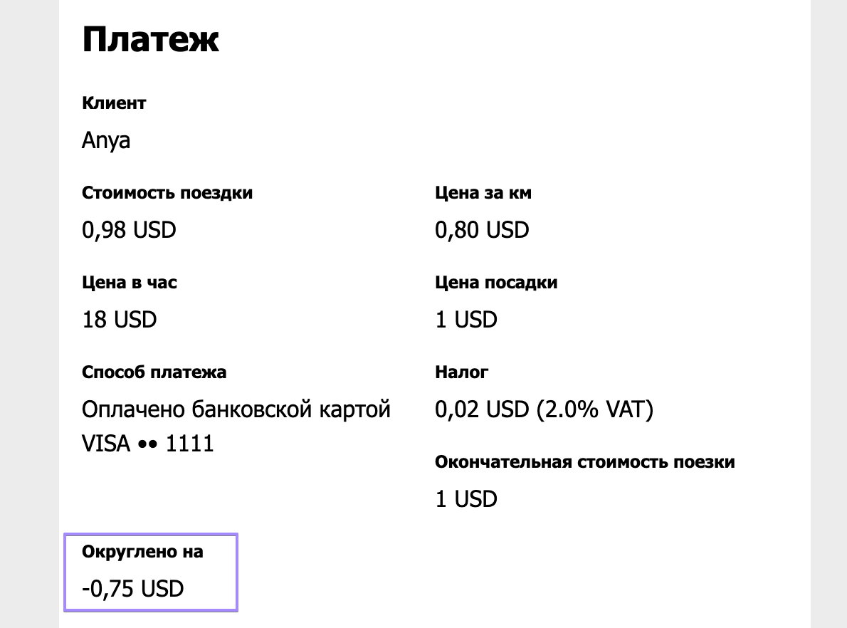 б) может округляться в большую сторону (больше или равна не округленной стоимости) - для списания дополнительной оплаты, которая добавляется к общей стоимости поездки, и платы за транзакцию. В таких случаях система изменяет цену в большую сторону, чтобы округлить финальную стоимость.