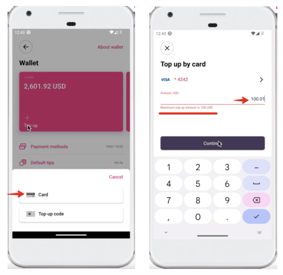 При попытке пополнить баланс кошелька на сумму, превышающую установленный лимит, появится ошибка: “Максимальная сумма пополнения …”.