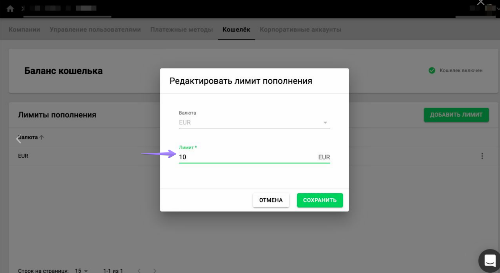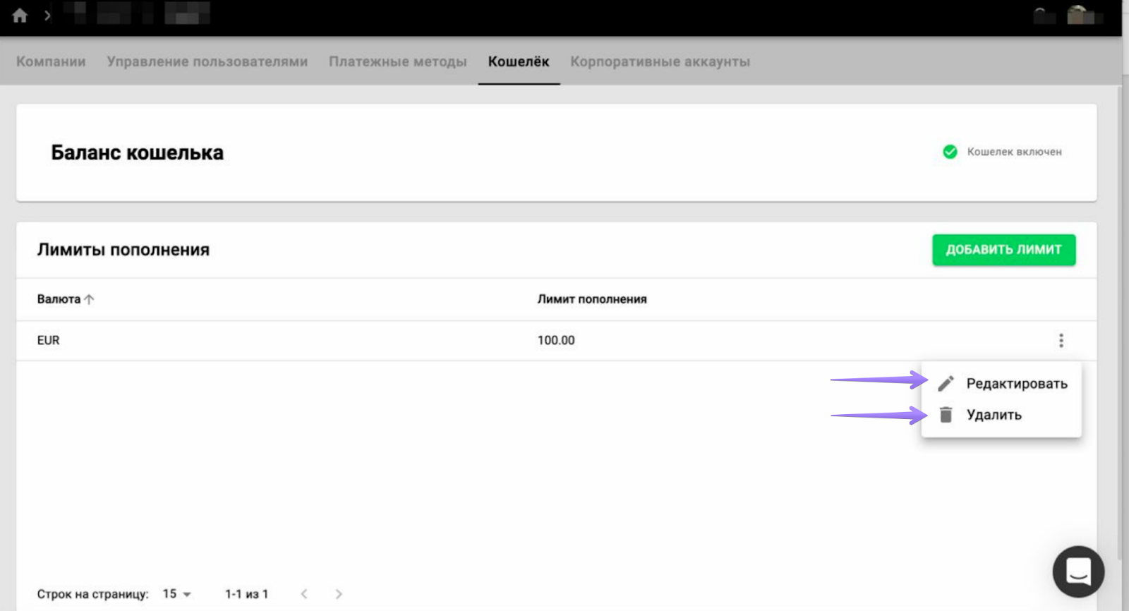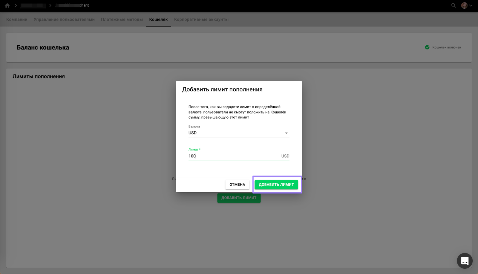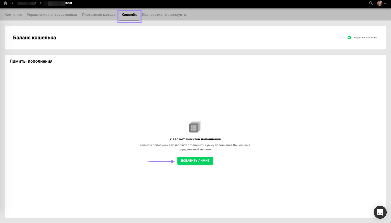 Чтобы задать лимит пополнения кошелька клиента, откройте расчетный центр вашего бренда.
