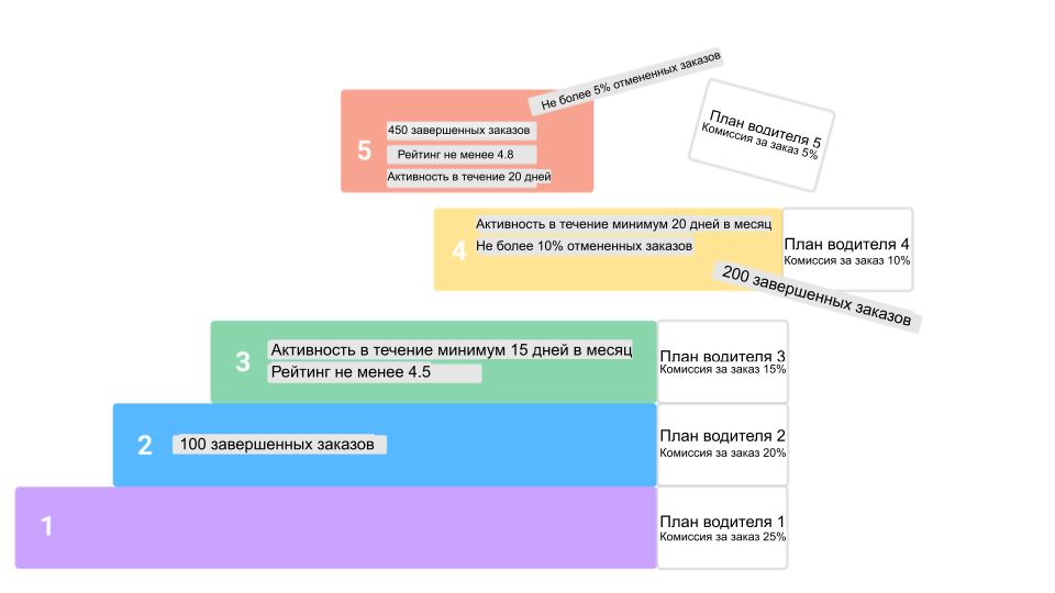 Уровни водителей - это новая функция, которая позволяет самым трудолюбивым водителям автоматически получать лучшие условия работы (например, стоимость подписки, количество включенных заказов и комиссии за них). Этот инструмент мотивирует водителей лучше работать и повышает их лояльность компании.