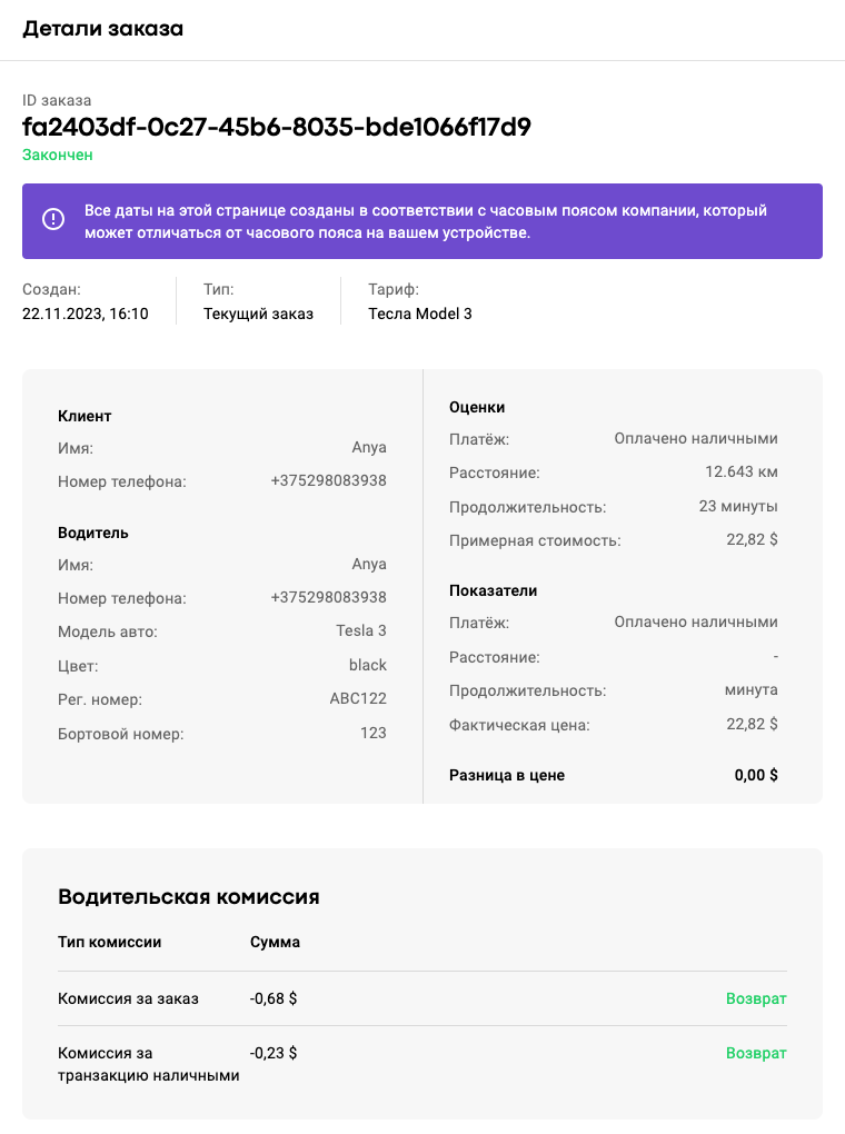 Все детали заказа отображаются в соответствии с часовым поясом компании, и он может отличаться от часового пояса менеджера, который осуществляет поиск.