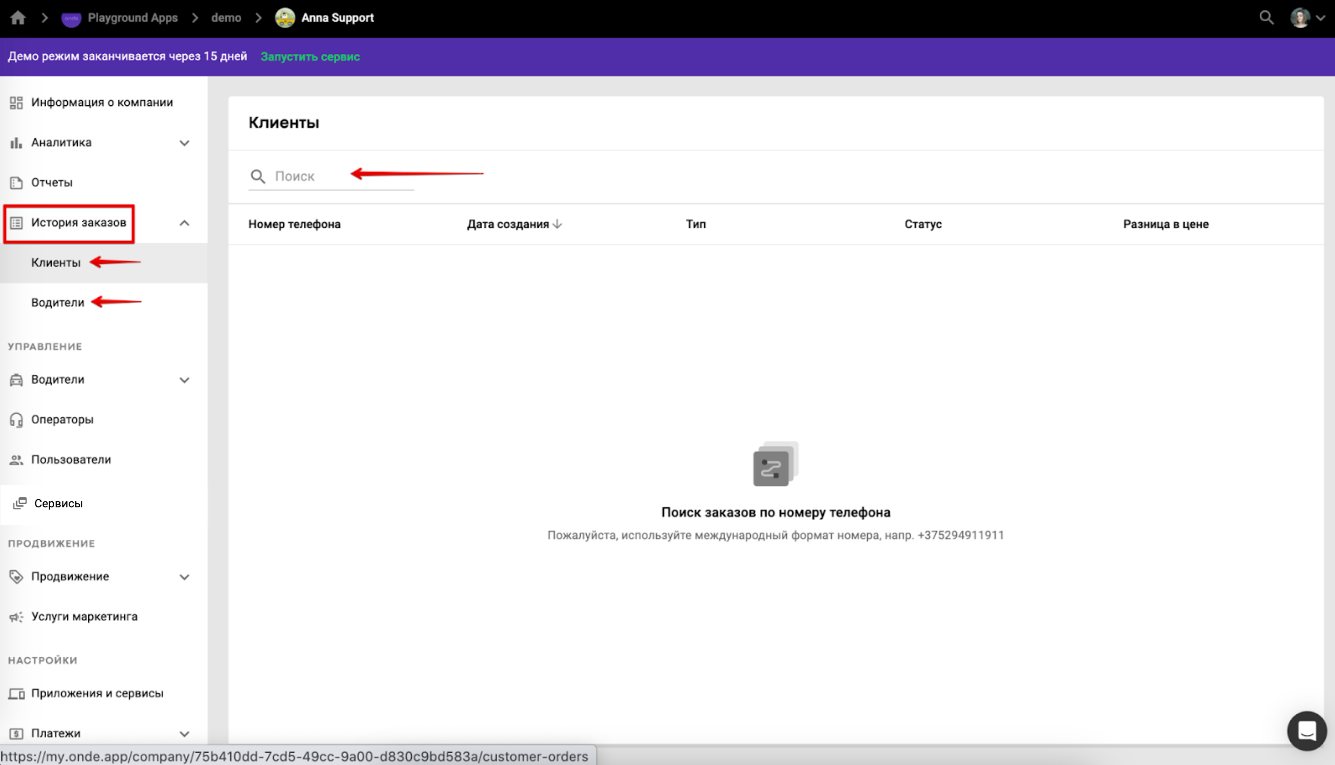 Логика поиска заказов одинакова для обеих вкладок. Давайте подробнее рассмотрим функционал на примере вкладки “Клиенты”.