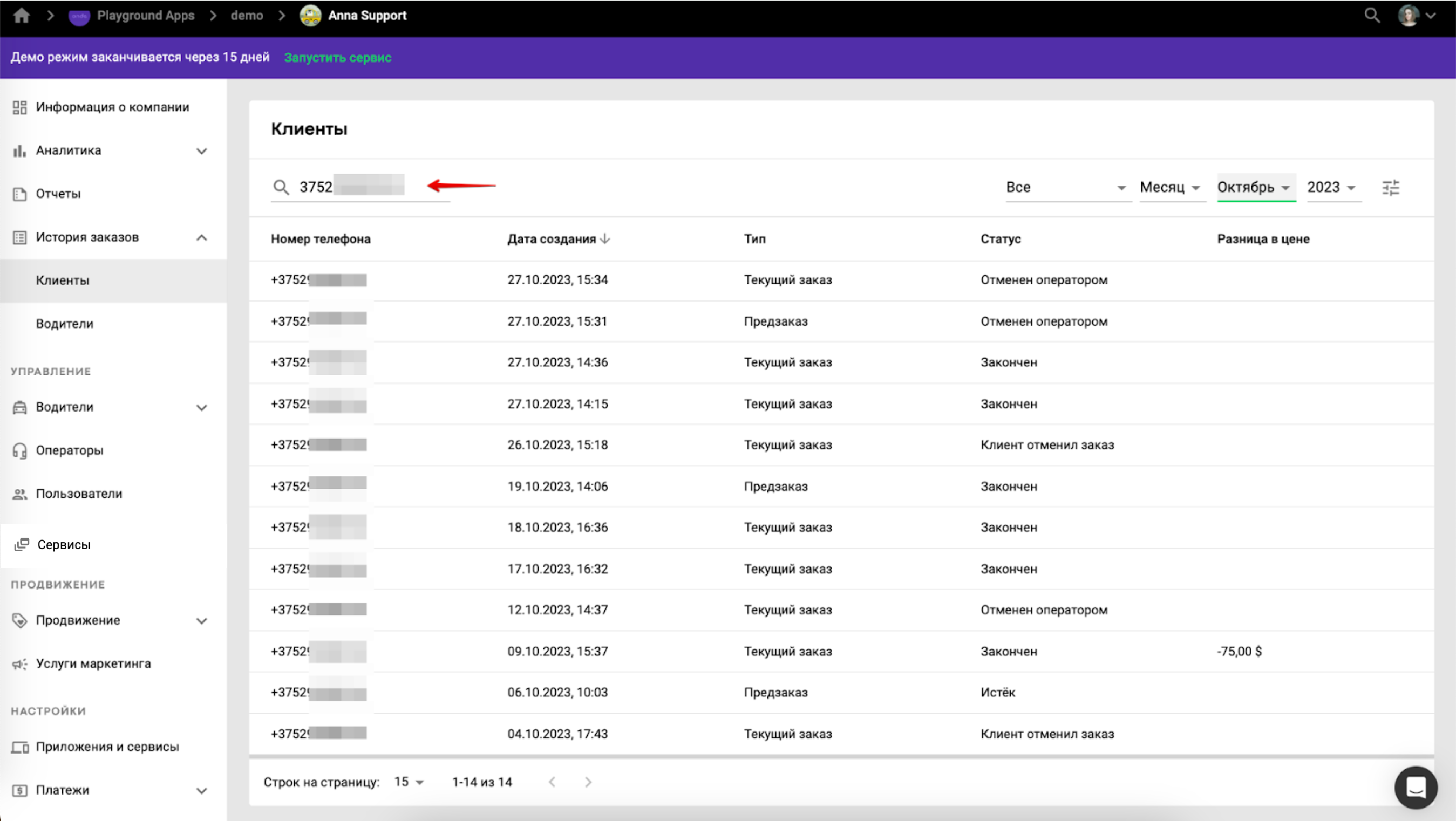 В поле “Поиск” введите номер телефона клиента в международном формате (с или без знака “+”). Вы можете применить к списку заказов нужный вам фильтр по следующим параметрам: