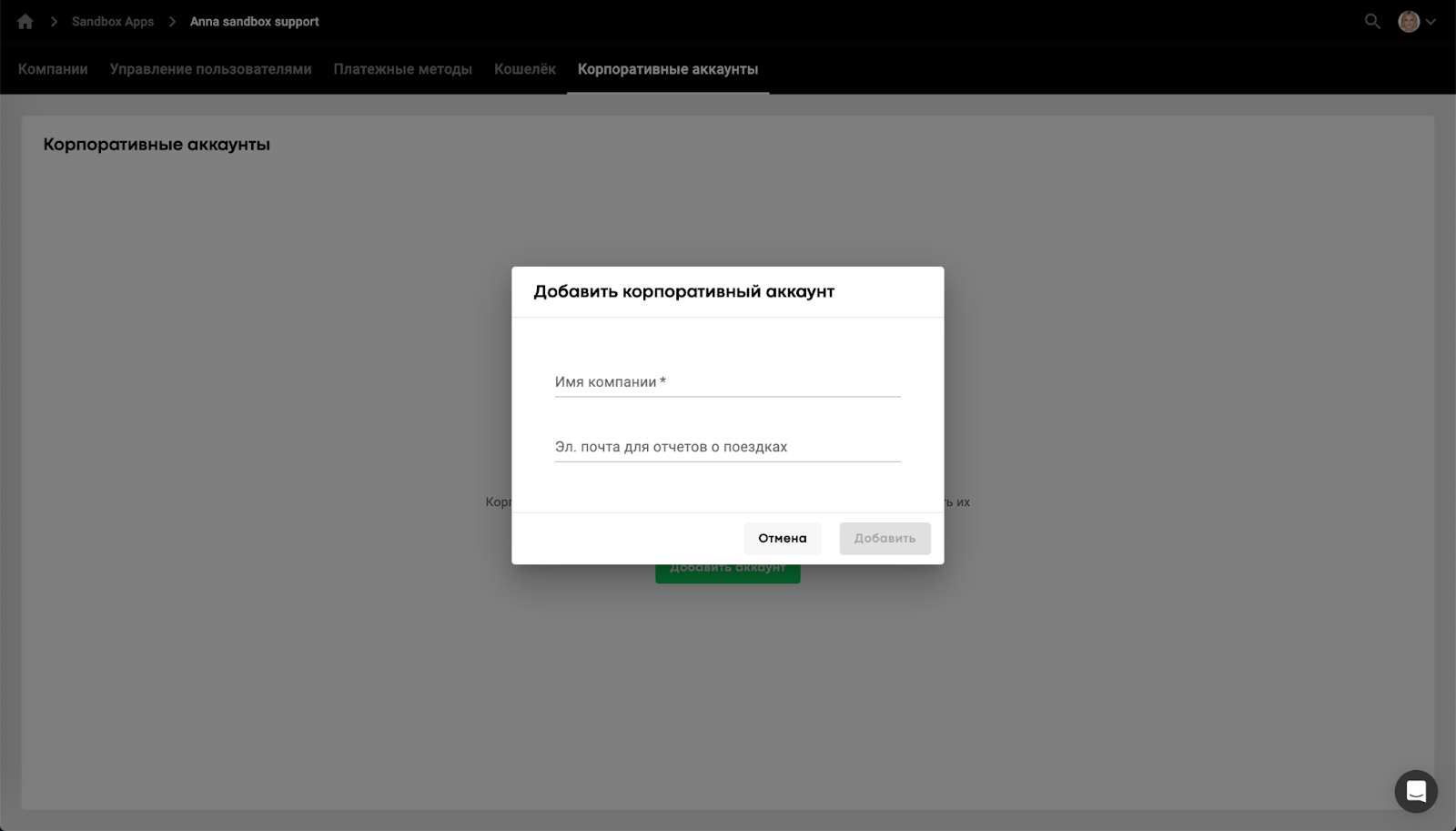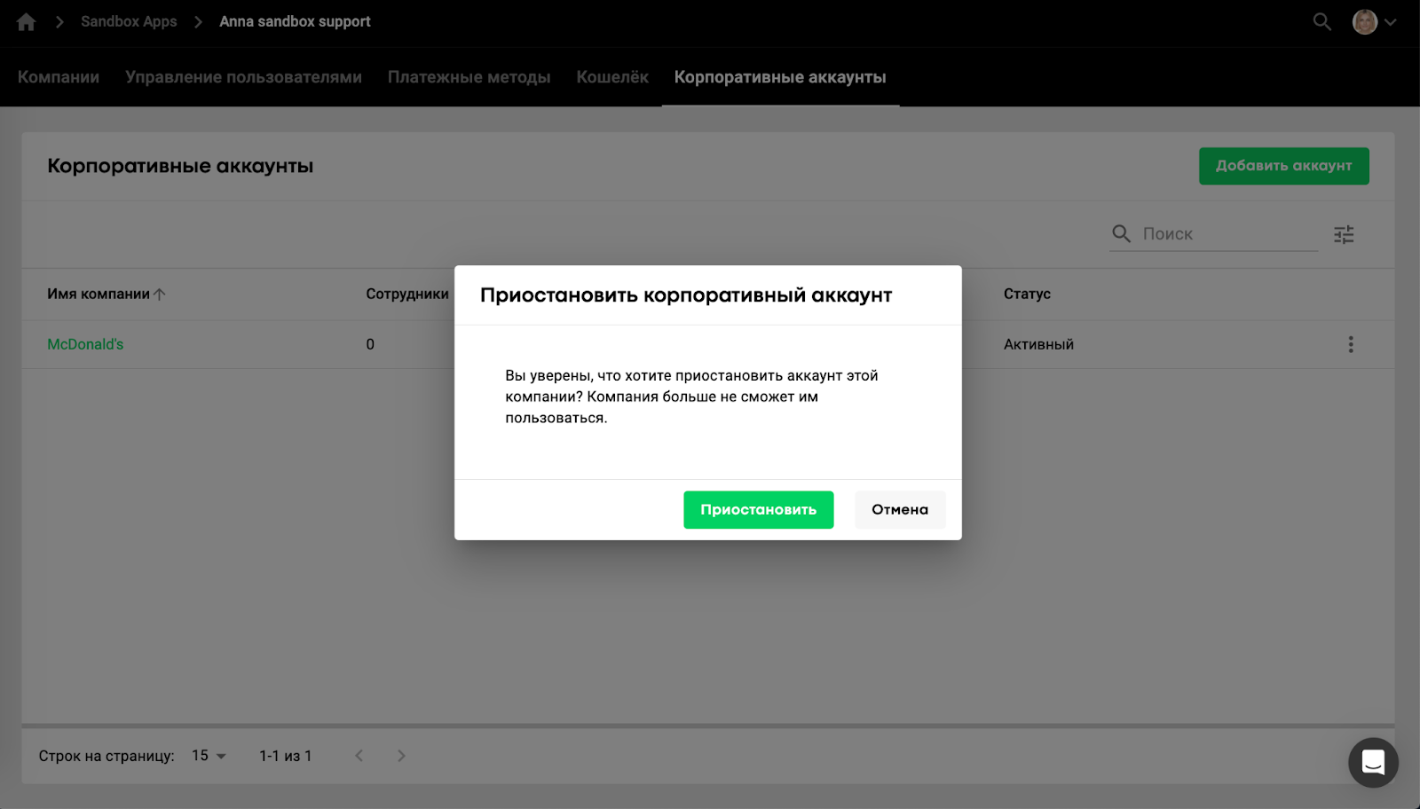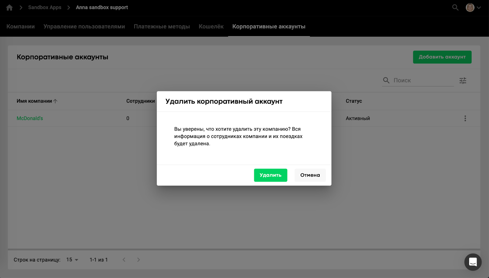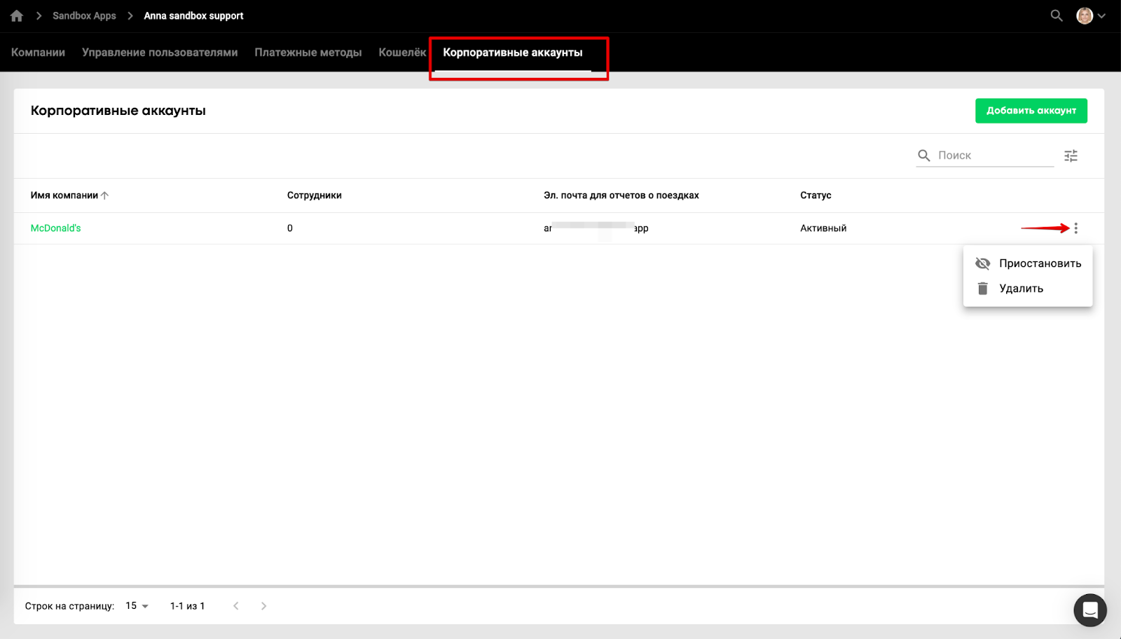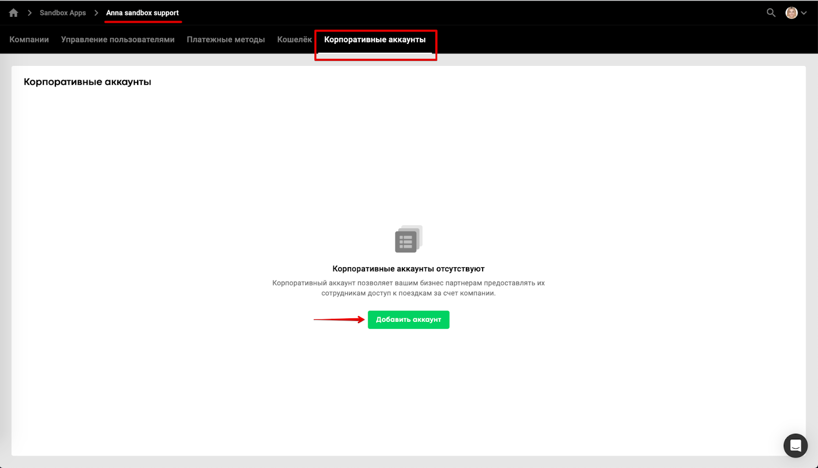 Управление корпоративными аккаунтами доступно менеджерам бренда или менеджерам расчетного центра.