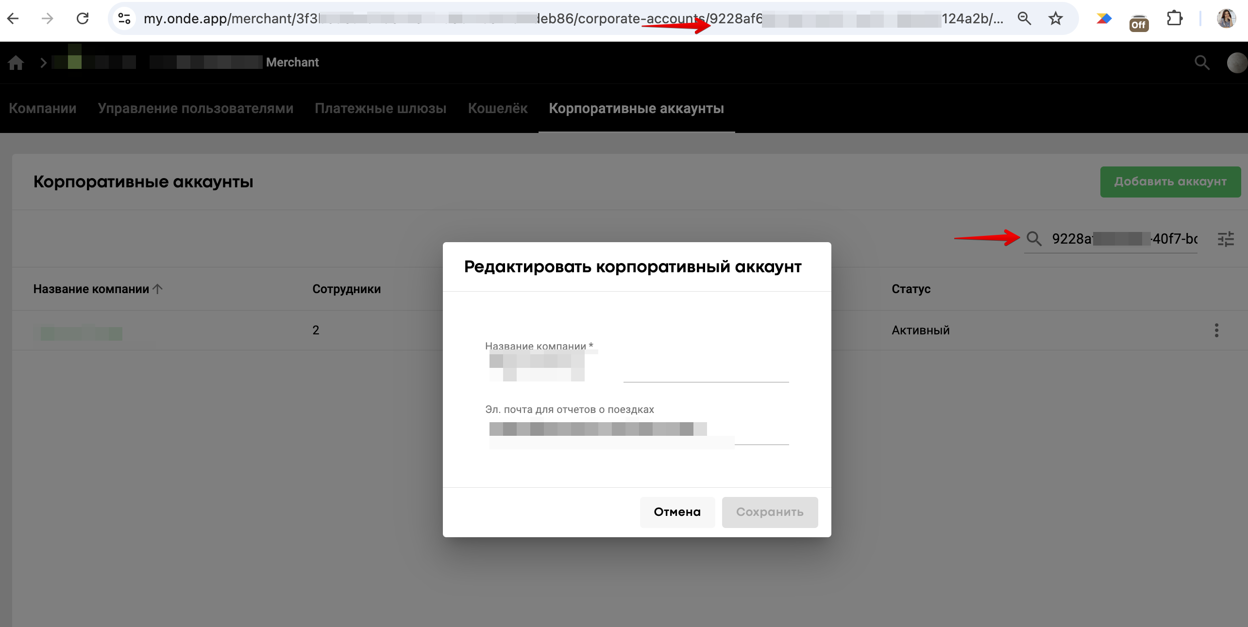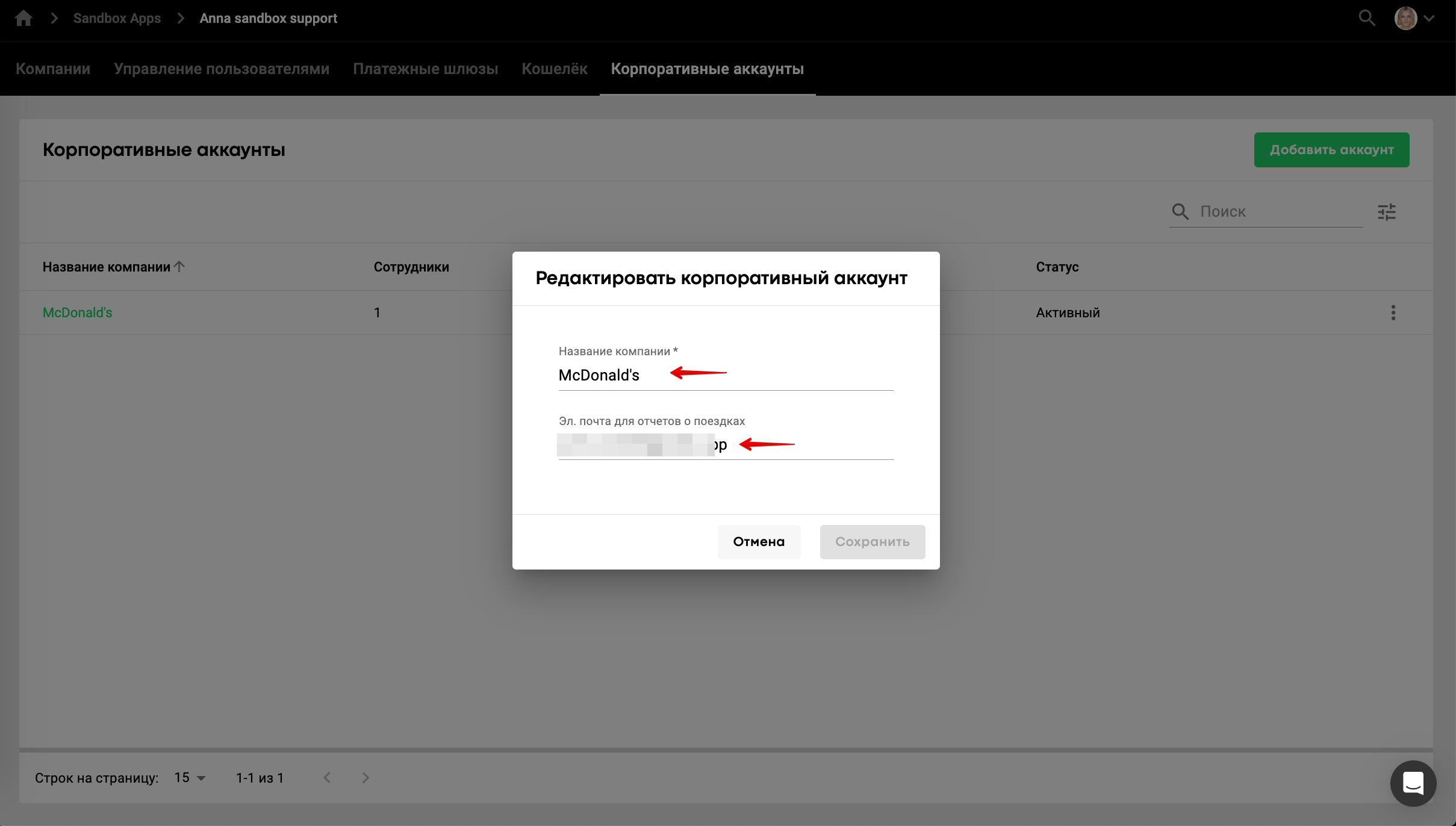 Чтобы отредактировать название/электронную почту корпоративного аккаунта, просто нажмите на строку с нужным корпоративным аккаунтом, и появится окно для редактирования данных.