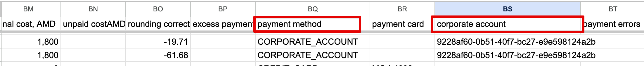 Заказы, оплаченные корпоративным аккаунтом, можно отсортировать в отчетах по заказам по методу оплаты (payment method) = Корпоративный аккаунт (Corporate account) и Corporate account ID (находится в урле учетной записи корпоративного аккаунта).
