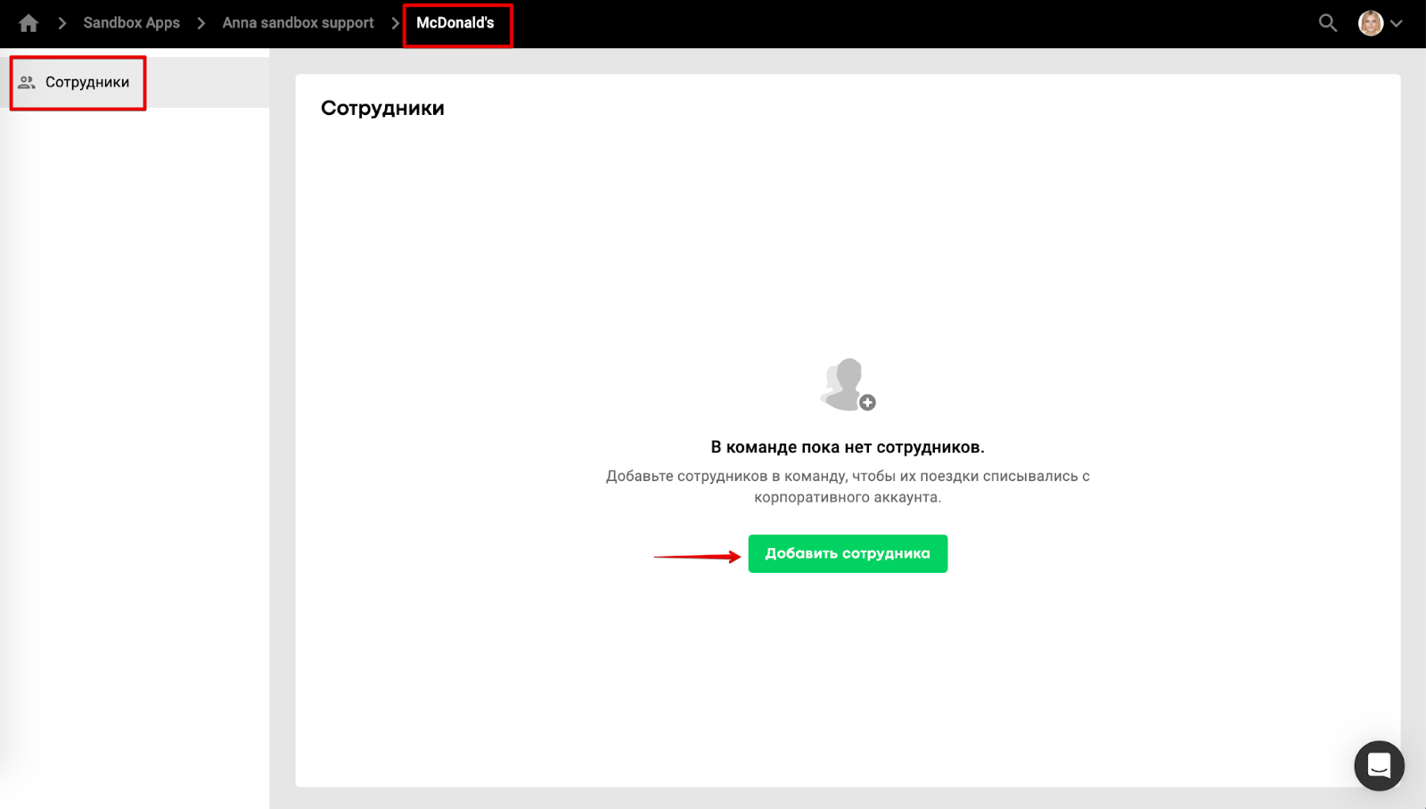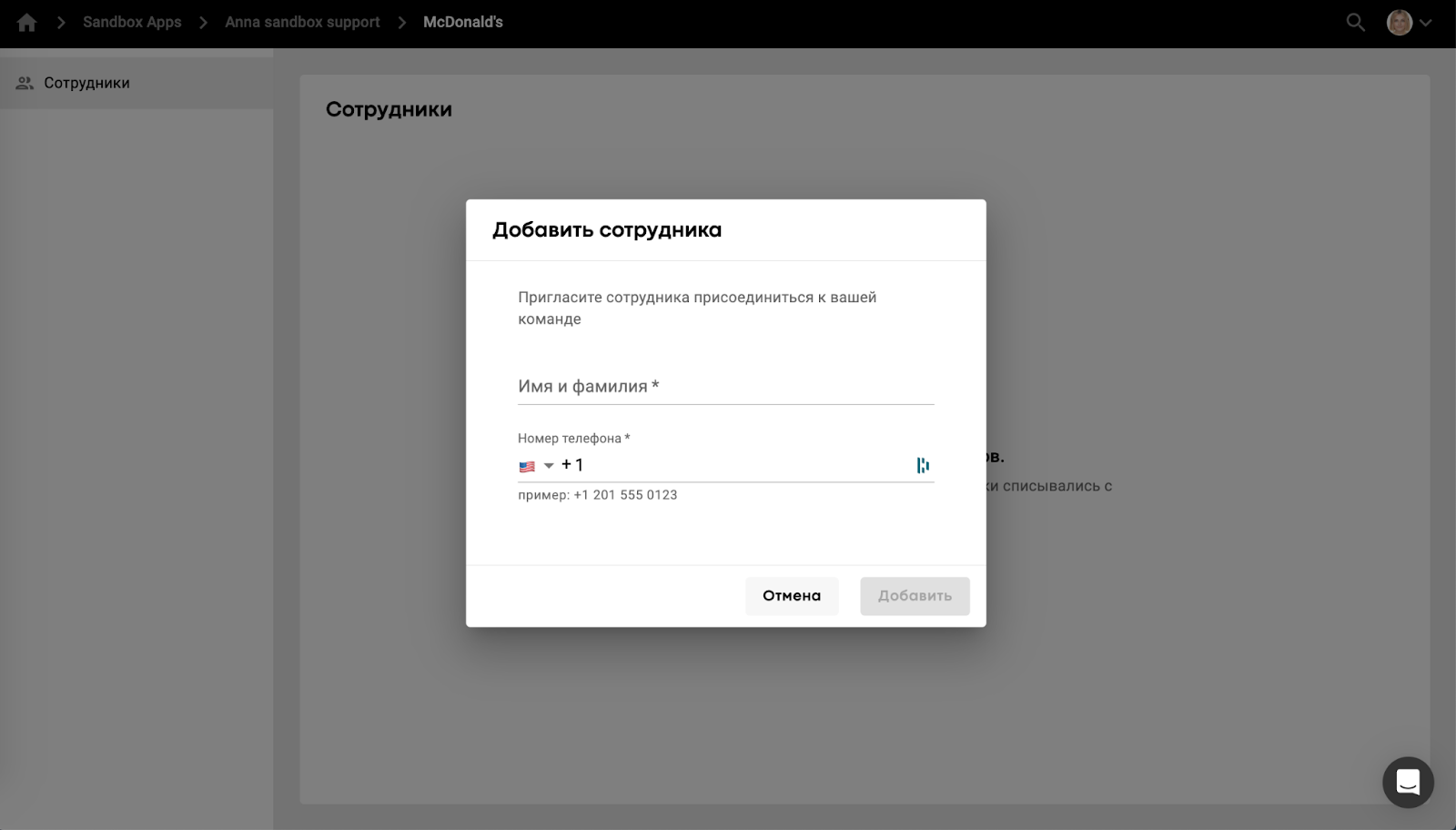 Чтобы добавить нового сотрудника в команду, откройте вкладку “Сотрудники” в нужном корпоративном аккаунте, нажмите на кнопку “ДОБАВИТЬ СОТРУДНИКА” и введите данные его профиля: полное имя и номер телефона.