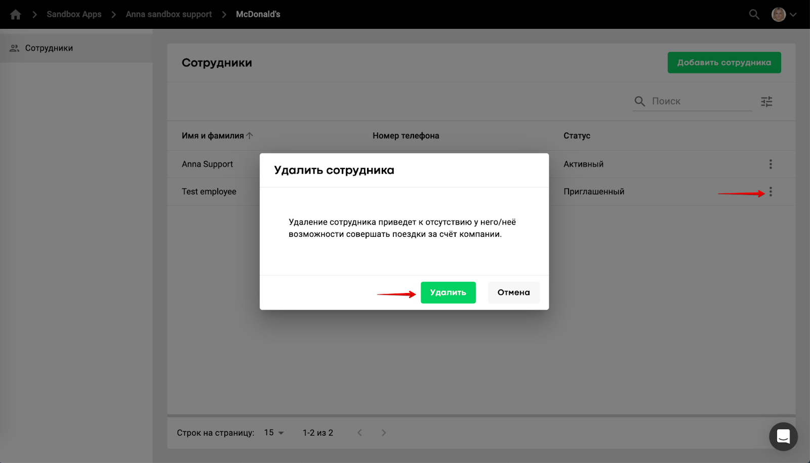 Чтобы удалить сотрудника из команды, откройте расширенное меню нужного профиля и выберите опцию “УДАЛИТЬ”. После этого действия сотрудник не сможет совершать поездки за счет своей компании. Данные о профиле сотрудника корпоративного аккаунта остаются в отчетах даже после его удаления.