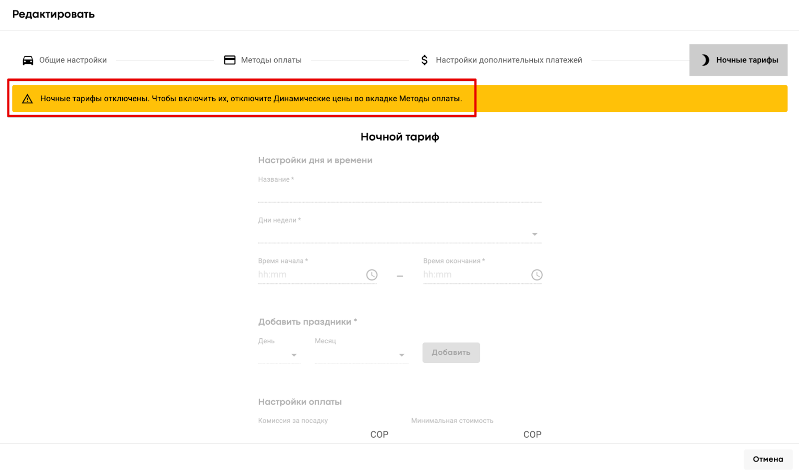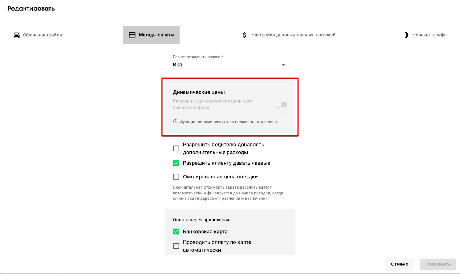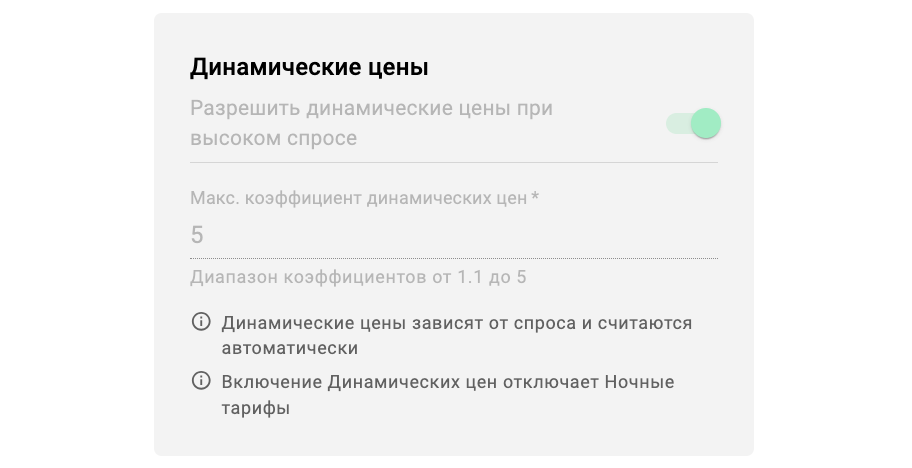 Если функция активирована, менеджер компании с доступом к сервисам может включать/отключать/редактировать динамические цены на уровне сервиса.