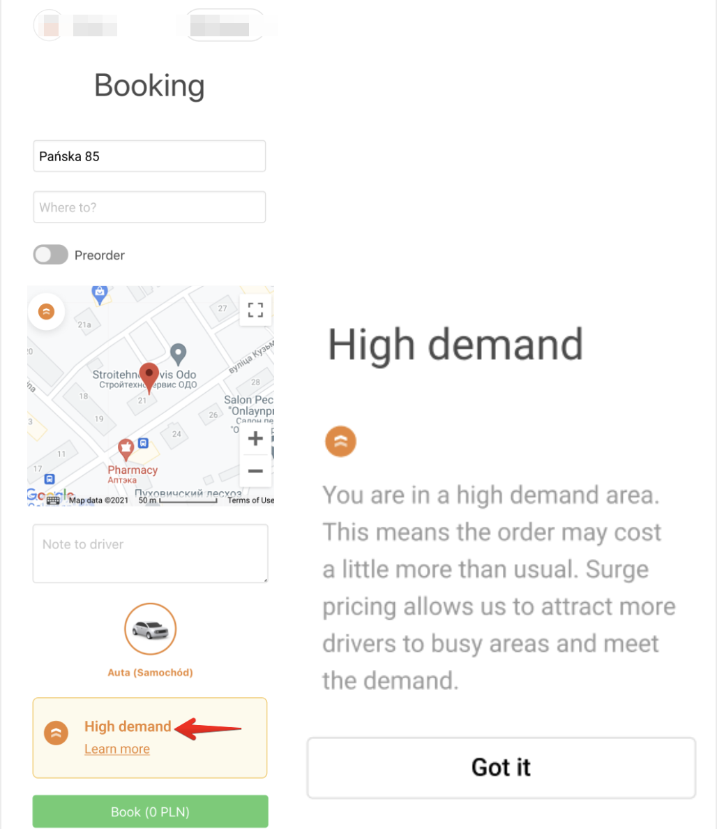 В приложении клиента сервис отмечается красным цветом и появляется предупреждение о динамических ценах