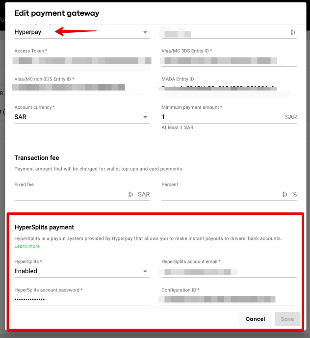 b. Fill all the required data into the related fields for Hyperpay, hover over to “HyperSplits Payment” section, select the option HyperSplits = Enabled and add all the required credentials.