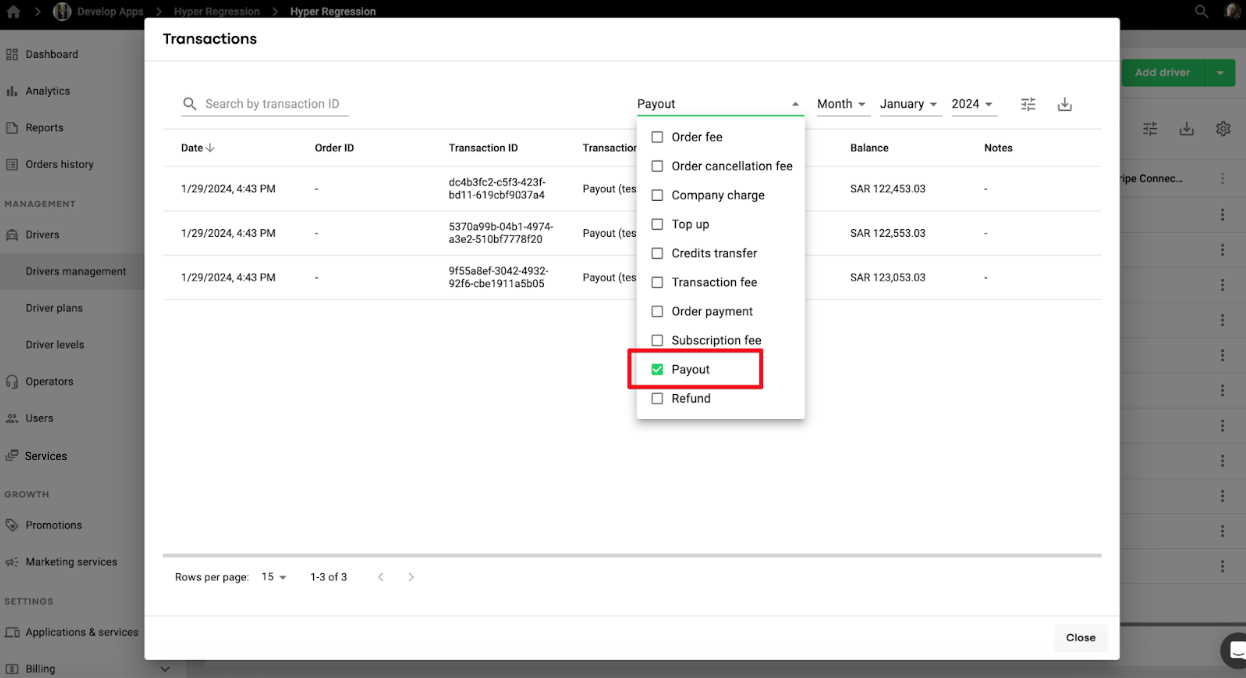 2. Driver’s profile in My Hub: access tab Drivers > Driver management > tap on “more items button” at the driver’s profile > choose “Transactions” > filter by Transaction type = “Payout” and review each payout transaction data.