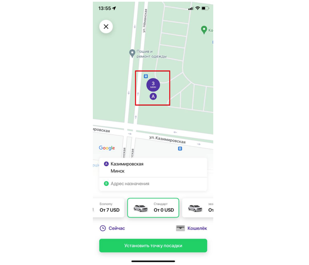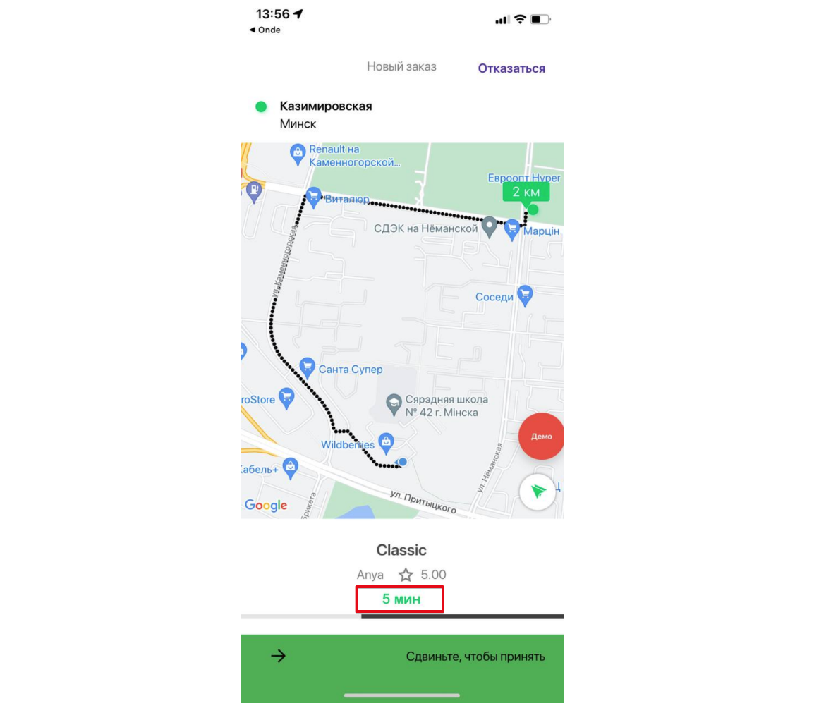 Выехал в 13:56 (До клиента: 7 мин)