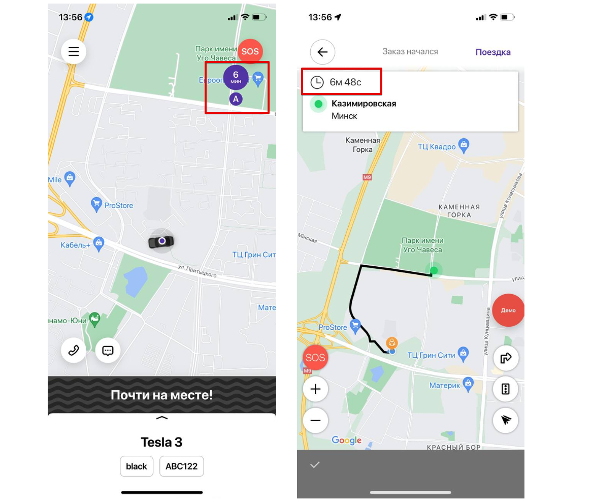 Когда заказ находится в статусе “Принят”, водитель и клиент могут отслеживать время прибытия в своих приложениях.
